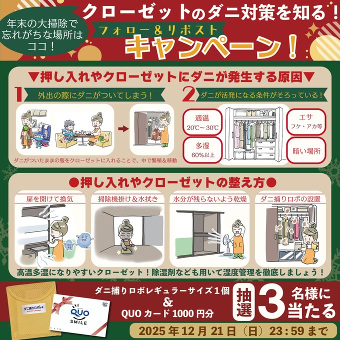 賞品:ダニ捕りロボ1個&QUOカード1000円分(3名様)
