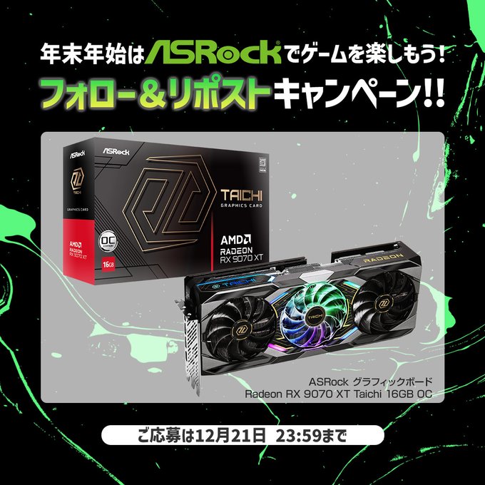 賞品:ASRock社製グラフィックボード「AMD Radeon RX 9070 XT Taichi 16GB OC」(1名様)