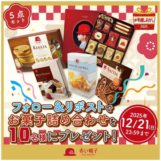 【X懸賞】お菓子詰め合わせを10名様にプレゼント 2025.12.20しあわせの赤い帽子‐#年越しおかし で大感謝祭 賞品:お菓子詰め合わせ(10名様) 締切:2025年12月21日(日)応募方法 1⃣@akaibohshi_jpをフォロー 2⃣投稿をリポスト or 引用リポスト※詳細はキャンペーンページにてご確認ください。応募はこちらから
