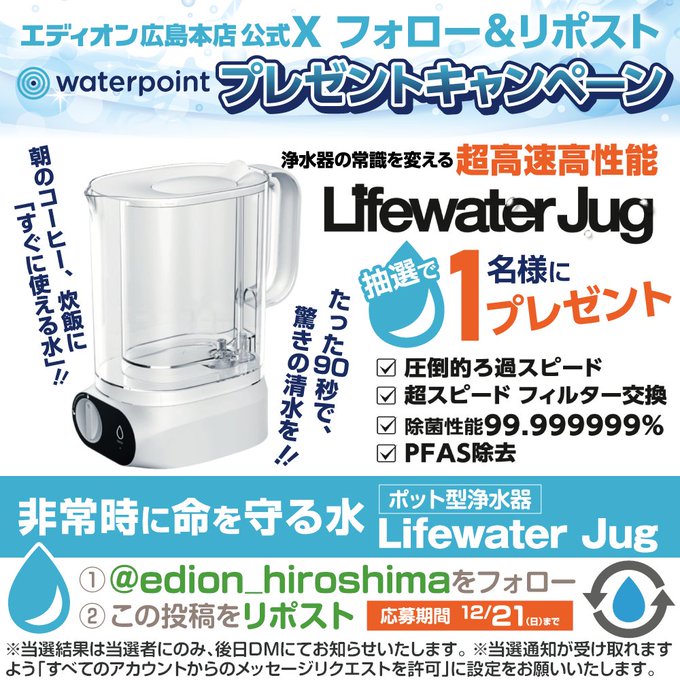 賞品:家庭用ポット型浄水器 ウォーターポイント「Lifewater Jug」(1名様)