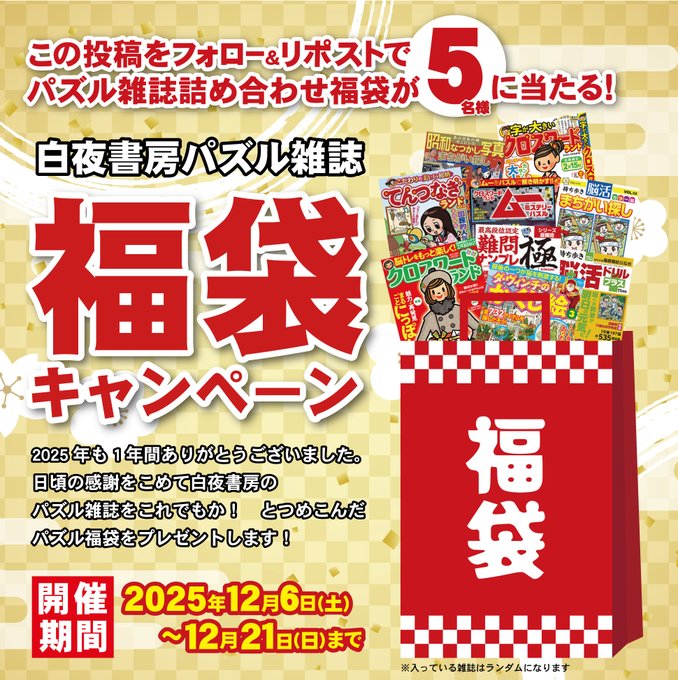 賞品:パズル雑誌詰め合わせ福袋(5名様)