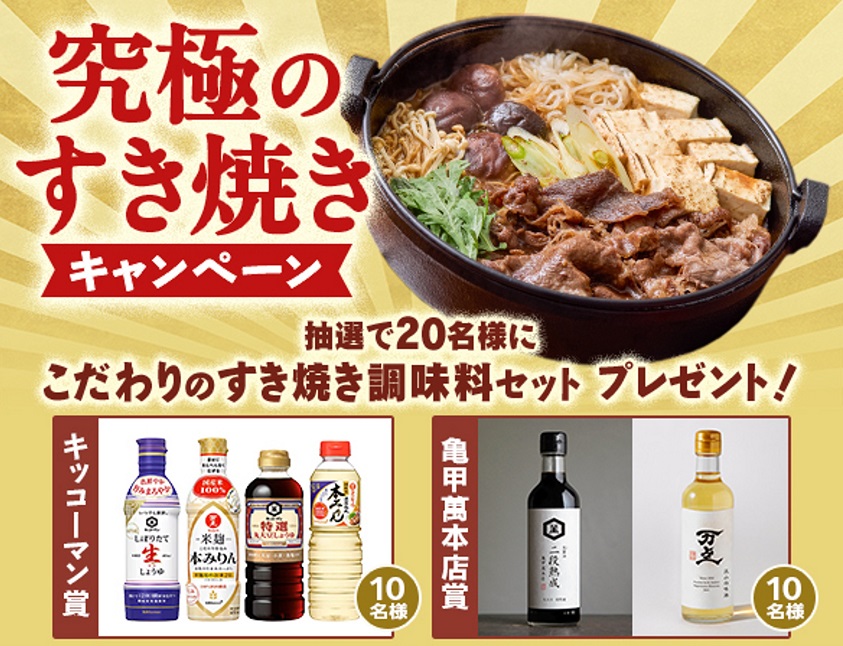 こだわりのすき焼き調味料セットを20名様にプレゼント 2025.12.20キッコーマン‐究極のすき焼きキャンペーン 賞品:こだわりのすき焼き調味料セット(20名様) 締切:2025年12月21日(日)ご応募には会員登録/ログインが必要です。※詳細はキャンペーンページにてご確認ください。応募はこちらから