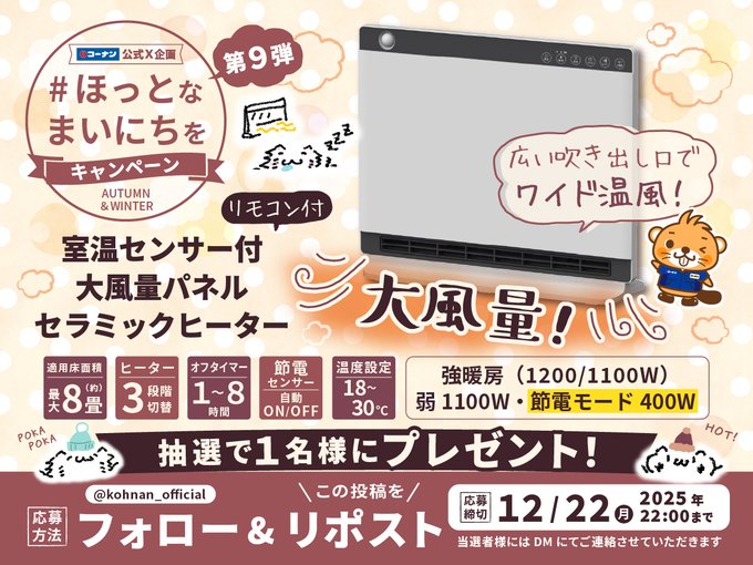 賞品:室温センサー付大風量パネルセラミックヒーター ヒートワイドスリム(1名様)