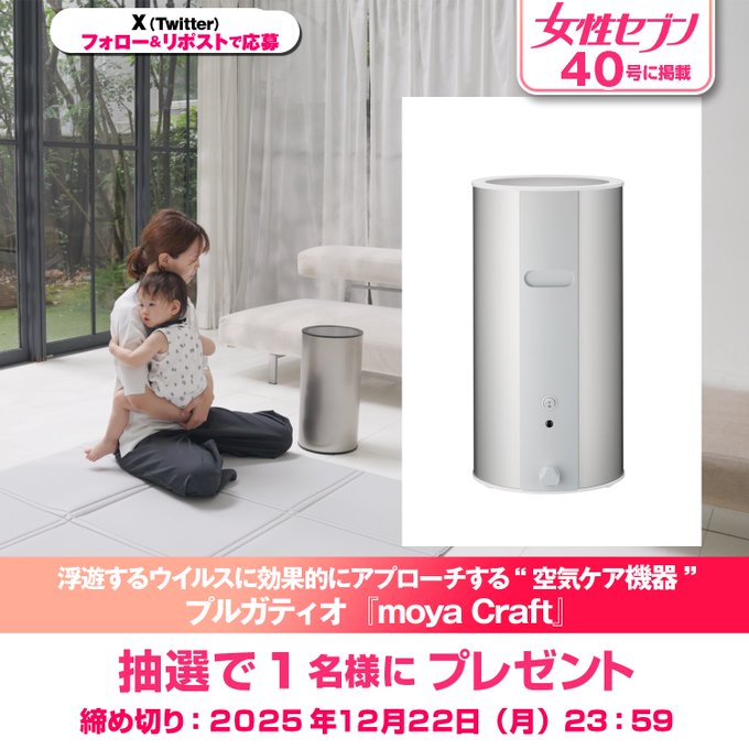 【X懸賞】moya Craftを1名様にプレゼント 2025.12.20女性セブン‐プレゼントキャンペーン 賞品:moya Craft(1名様) 締切:2025年12月22日(月)応募方法 ①@joseiseven をフォロー ②投稿をいいね&RP/RT(リポスト)※詳細はキャンペーンページにてご確認ください。応募はこちらから