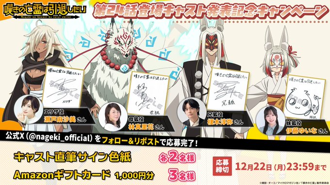 賞品:新キャスト直筆サイン入り色紙、Amazonギフト券1,000円分(11名様)