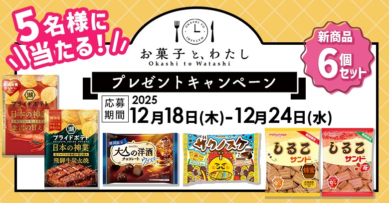 新発売のお菓子6種の詰合せを5名様にプレゼント 2025.12.21 2025.12.20お菓子と、わたし‐読者限定プレゼントキャンペーン 賞品:新発売のお菓子6種の詰合せ(5名様) 締切:2025年12月24日(水)アンケートに答えてご応募ください。※詳細はキャンペーンページにてご確認ください。応募はこちらから