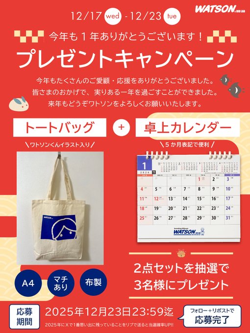 賞品:卓上カレンダー&A4対応トートバッグ(3名様)