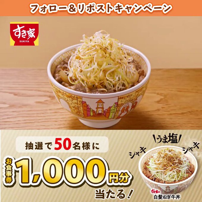 【X懸賞】お食事券1,000円分を50名様にプレゼント 2025.12.21すき家‐フォロー&リポストキャンペーン 賞品:お食事券1,000円分(50名様) 締切:2025年12月23日(火)公式X(Twitter)アカウントをフォロー&キャンペーン対象ポストをリポストしてご応募ください。※詳細はキャンペーンページにてご確認ください。応募はこちらから