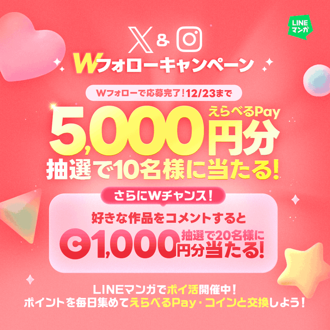 【X・Instagram懸賞】えらべるPay5,000円分、マンガコイン1,000円分を合計30名様にプレゼント