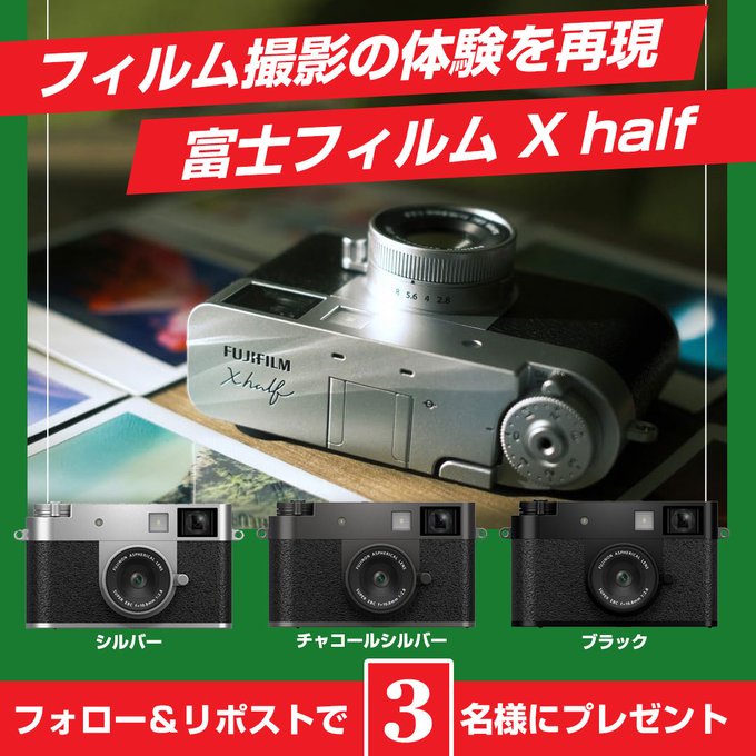【X懸賞】富士フィルム X halfを3名様にプレゼント 2025.12.21ヨドバシ@映像機材専門‐プレゼントキャンペーン 賞品:富士フィルム X half(3名様) 締切:2025年12月23日(火)👉このカメラを持って訪れたい場所・人は❓👉フォロー&リポスト👉12/23まで※詳細はキャンペーンページにてご確認ください。応募はこちらから