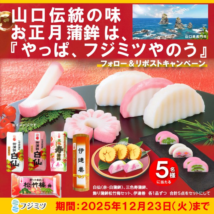 【X懸賞】蒲鉾&伊達巻セットを5名様にプレゼント 2025.12.21フジミツ株式会社‐フォロー&リポストキャンペーン 賞品:蒲鉾&伊達巻セット(5名様) 締切:2025年12月23日(火)公式X(Twitter)アカウントをフォロー&キャンペーン対象ポストをリポストしてご応募ください。※詳細はキャンペーンページにてご確認ください。応募はこちらから
