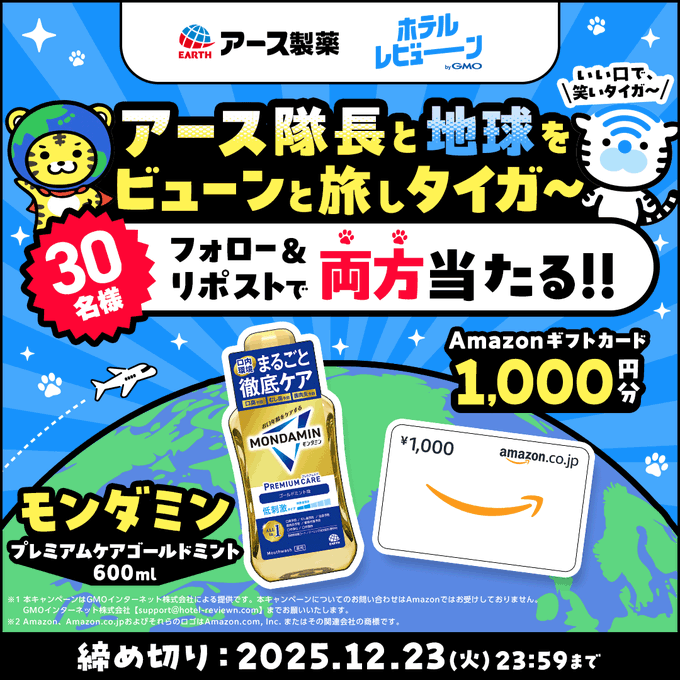 @EarthOfficialJP と @hotel_reviewnをフォロー&キャンペーン対象ポストをリポストしてご応募ください。