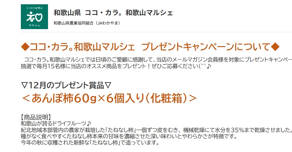 あんぽ柿60g×6個入り(化粧箱)を15名様にプレゼント 2025.12.22JAタウン‐ココ・カラ。和歌山マルシェ プレゼントキャンペーン 賞品:あんぽ柿60g×6個入り(化粧箱)(15名様) 締切:2025年12月29日(月)メールアドレスに以下の必要事項を記載して送信してください。※詳細はキャンペーンページにてご確認ください。応募はこちらから