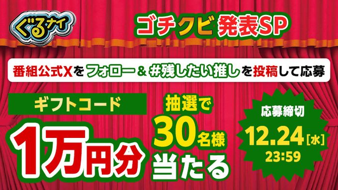 ぐるぐるナインティナイン‐ゴチの“残したい推し”は誰?「ぐるナイ」Xでプレゼントキャンペーン