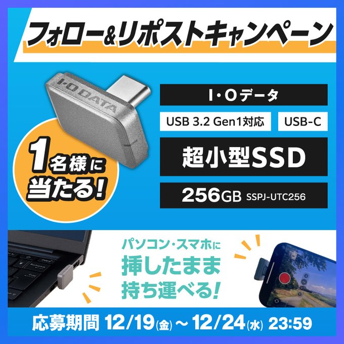 賞品:I・Oデータ 超小型SSD 256GB SSPJ-UTC256(1名様)