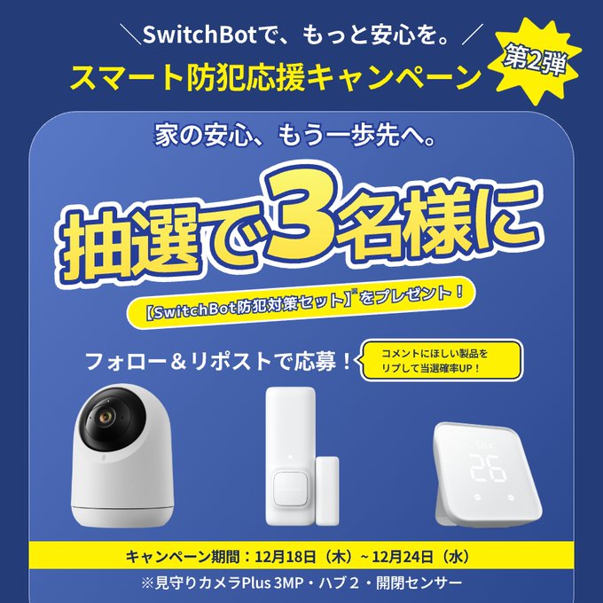 【X懸賞】防犯対策セットを3名様にプレゼント 2025.12.22SwitchBotスマート防犯応援キャンペーン 賞品:防犯対策セット(3名様) 締切:2025年12月24日(水)公式X(Twitter)アカウントをフォロー&キャンペーン対象ポストをリポストしてご応募ください。※詳細はキャンペーンページにてご確認ください。応募はこちらから