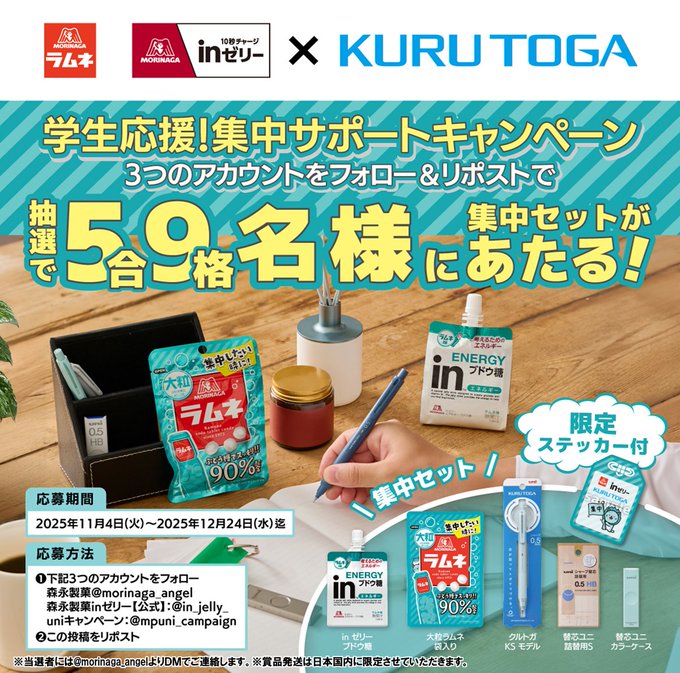 賞品:inゼリー・森永ラムネ・クルトガ・替芯ユニ・オリジナルラムねこステッカーの「集中セット」(59名様)