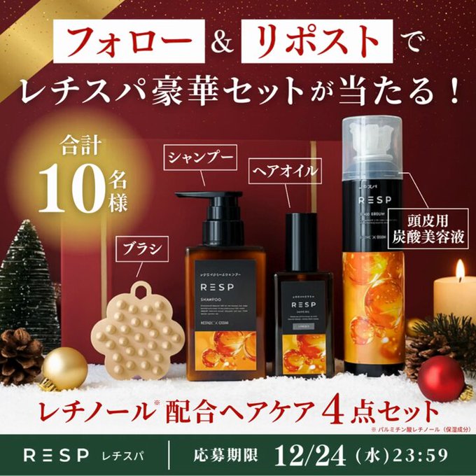 【X懸賞】クリスマス限定セットを10名様にプレゼント 2025.12.22レチスパ‐フォロー&リポストキャンペーン 賞品:クリスマス限定セット(10名様) 締切:2025年12月24日(水)公式X(Twitter)アカウントをフォロー&キャンペーン対象ポストをリポストしてご応募ください。※詳細はキャンペーンページにてご確認ください。応募はこちらから