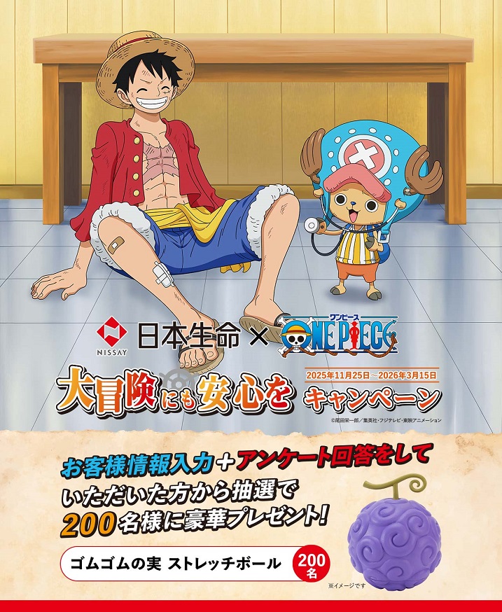 【LINE懸賞】ゴムゴムの実 ストレッチボールを200名様にプレゼント 2025.12.23 2025.12.22NISSAY‐大冒険にも安心をキャンペーン 賞品:ゴムゴムの実 ストレッチボール(200名様) 締切:2026年3月15日(日)アンケートに答えてご応募ください。※詳細はキャンペーンページにてご確認ください。応募はこちらから