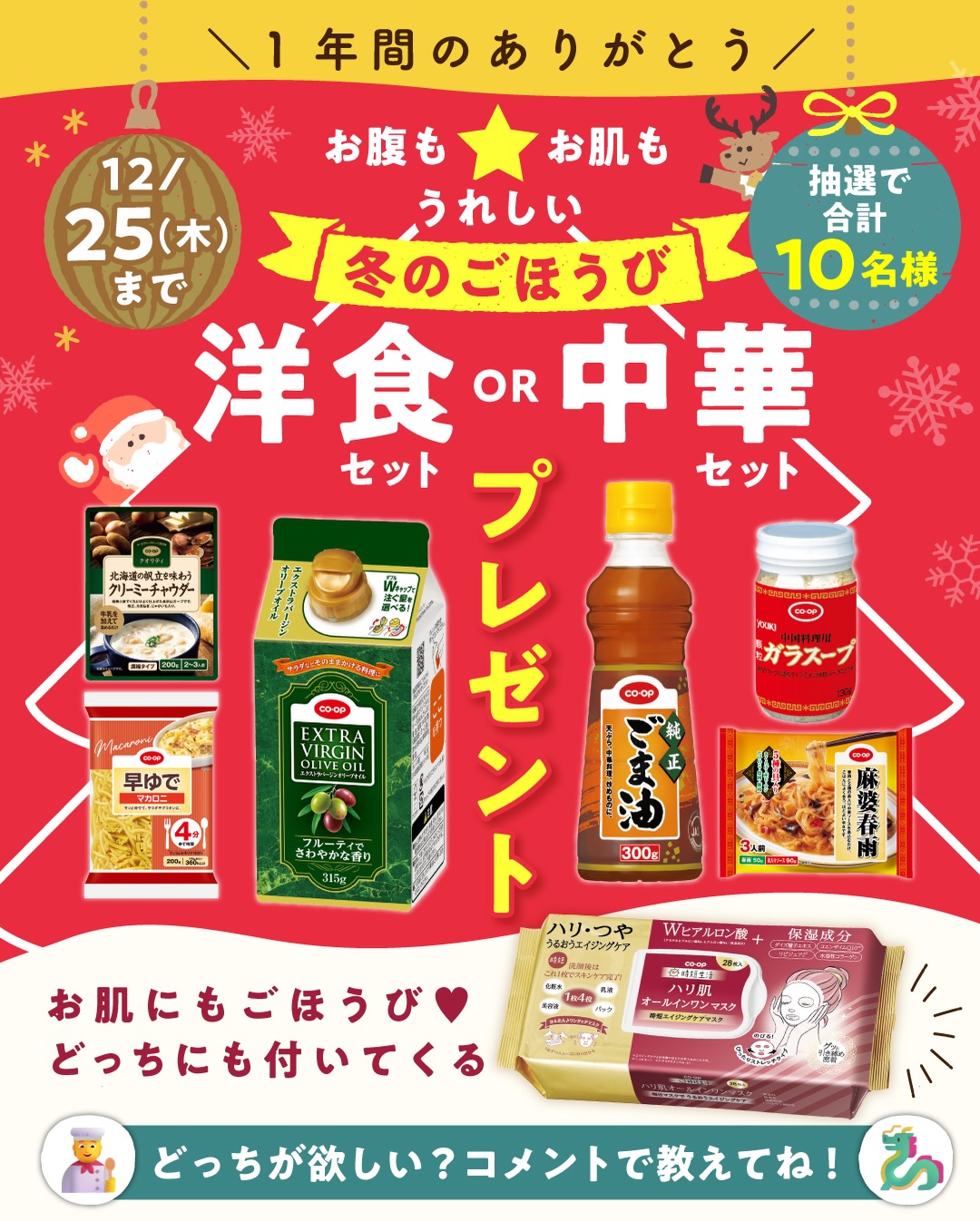 【Instagram懸賞】コープ商品詰め合わせを10名様にプレゼント 2025.12.23エフコープ‐プレゼントキャンペーン 賞品:コープ商品詰め合わせ(10名様) 締切:2025年12月25日(木)①抽選時に @fcoop_fukuoka をフォローをしている方 ②ハイライトから応募フォームへ※詳細はキャンペーンページにてご確認ください。応募はこちらから