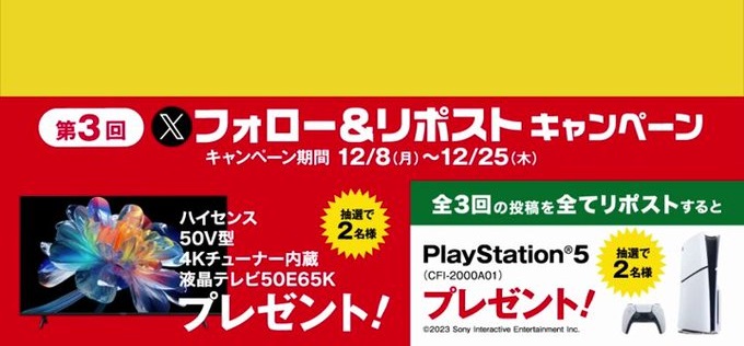 【X懸賞】ハイセンス50V型4Kチューナー内蔵液晶テレビ、PlayStation 5を合計4名様にプレゼント 2025.12.24ゲオ‐フォロー&リポストキャンペーン 賞品:4Kテレビ、PS5(合計4名様) 締切:2025年12月25日(木)公式X(Twitter)アカウントをフォロー&キャンペーン対象ポストをリポストしてご応募ください。※詳細はキャンペーンページにてご確認ください。応募はこちらから