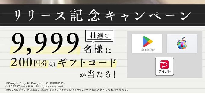 賞品:Apple Gift Card または Google Play ギフトコード最大10,000円分(10,009名様)