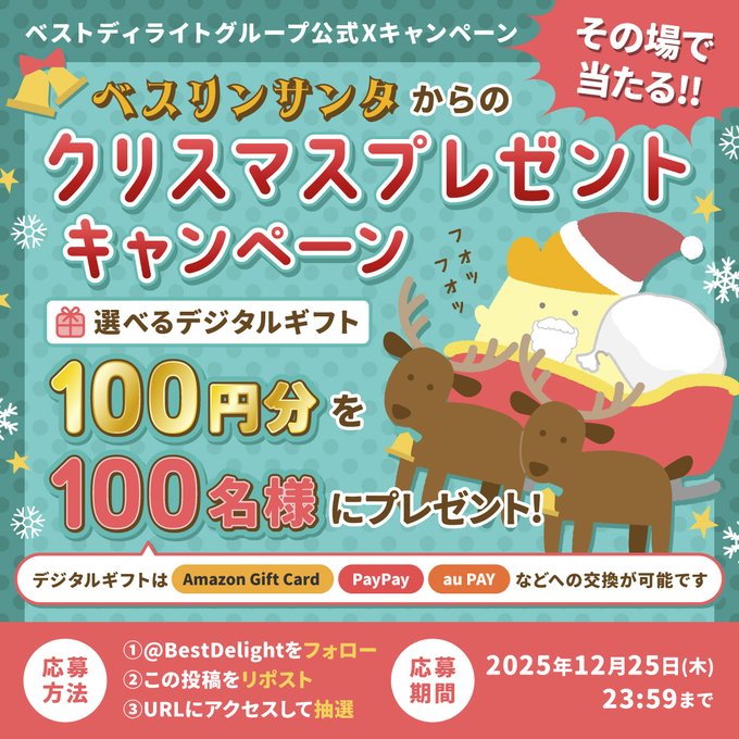 ベストディライトグループ公式X(Twitter)アカウントをフォロー&キャンペーン対象ポストをリポストして、記載されているURLからご応募ください。