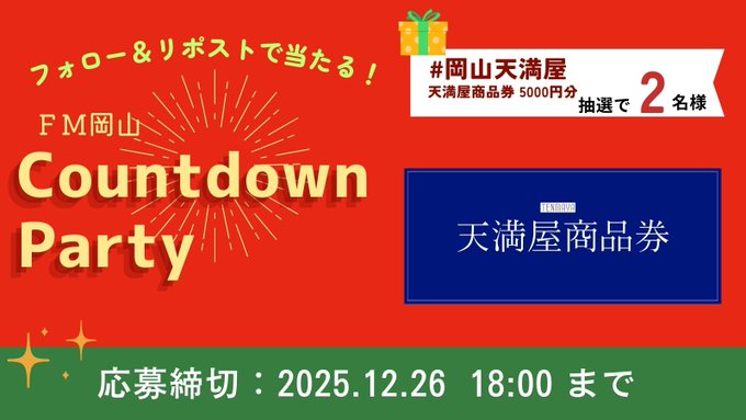 【X懸賞】岡山天満屋でご利用頂ける天満屋商品券5000円分を2名様にプレゼント 2025.12.24FM岡山‐プレゼントキャンペーン 賞品:天満屋商品券5000円分(2名様) 締切:2025年12月26日(金)応募方法 ① アカウントをフォロー ② #岡山天満屋 をつけて、投稿をリポスト※詳細はキャンペーンページにてご確認ください。応募はこちらから