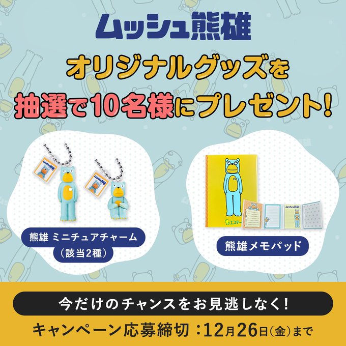 賞品:熊雄のミニチュアチャームとメモパッド(10名様)