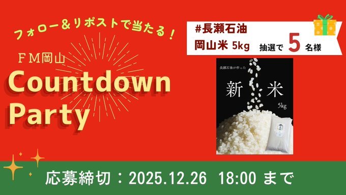 【X懸賞】岡山米 5㎏を5名様にプレゼント 2025.12.24FM岡山‐プレゼントキャンペーン 賞品:岡山米 5㎏(5名様) 締切:2025年12月26日(金)応募方法 ① アカウントをフォロー ② #長瀬石油 をつけて、投稿をリポスト※詳細はキャンペーンページにてご確認ください。応募はこちらから