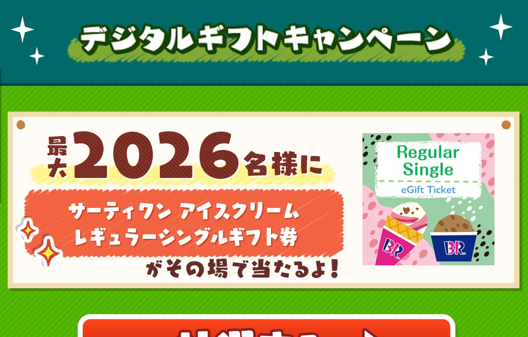 【毎日・アプリ】サーティワンアイスクリーム レギュラーシングルギフト券が2,026名様にその場で当たる! 2025.12.25 2025.12.24‐その場で当たるキャンペーン 賞品:サーティワンアイスクリーム レギュラーシングルギフト券(最大2,026名様) 締切:2026年1月7日(水)アプリ内からご応募ください。※詳細はキャンペーンページにてご確認ください。応募はこちらから