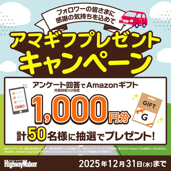Amazonギフト1,000円分を50名様にプレゼント 2025.12.25 2025.12.24ハイウェイウォーカー‐アンケートに答えてアマギフを当てよう 賞品:Amazonギフト1,000円分(50名様) 締切:2025年12月31日(水)アンケートに答えてご応募ください。※詳細はキャンペーンページにてご確認ください。応募はこちらから