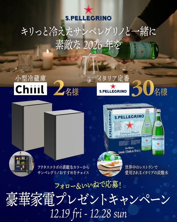 賞品:日立冷蔵庫「Chiiil」R-MR7S、サンペレグリノ(合計32名様)