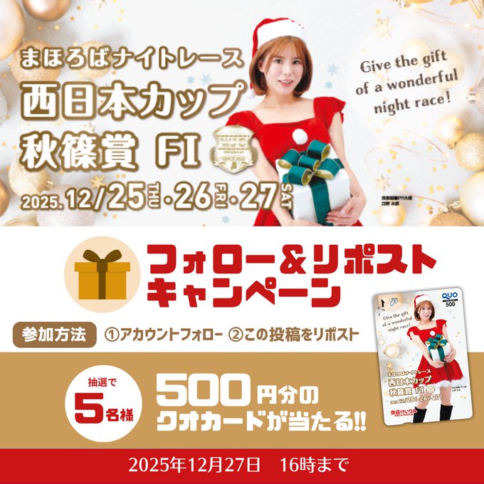 【X懸賞】QUOカード500円分を5名様にプレゼント 2025.12.25飛天ちゃん@奈良けいりん‐プレゼントキャンペーン 賞品:QUOカード500円分(5名様) 締切:2025年12月27日(土)16:001⃣アカウントをフォロー 2⃣引用リポスト(コメント付きだと嬉しい!)※詳細はキャンペーンページにてご確認ください。応募はこちらから