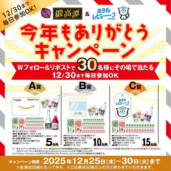 賞品:鍛高譚シリーズやグッズ、アマゾンギフトカードなど(合計30名様)