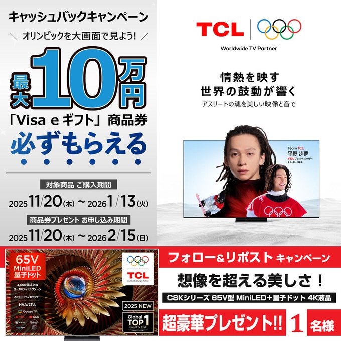【X懸賞】TCL C8Kシリーズ 65V型 Mini LEDテレビを1名様にプレゼント 2025.12.26ヨドバシカメラ‐プレゼントキャンペーン 賞品:TCL C8Kシリーズ 65V型 Mini LEDテレビ(1名様) 締切:2025年12月28日(日)👉フォロー&リポスト👉TCLのテレビでどの競技が見たい❓※詳細はキャンペーンページにてご確認ください。応募はこちらから
