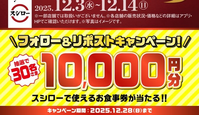 賞品:スシローで使えるお食事券10,000円分(30名様)