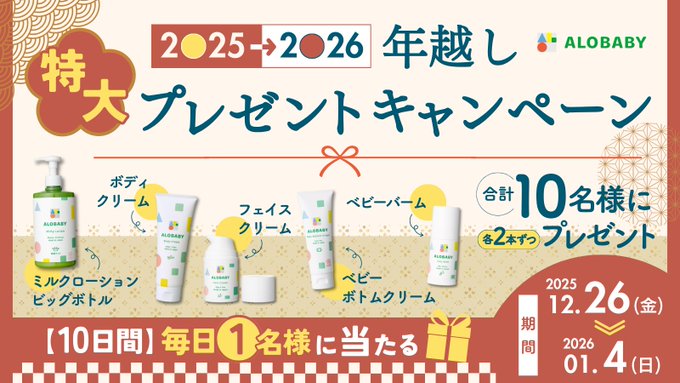 【毎日・X懸賞】アロベビーの最強保湿アイテムを10名様にプレゼント 2025.12.27 2025.12.26ALOBABY‐年越しの大型プレゼント企画 賞品:アロベビーの最強保湿アイテム(毎日1名様) 締切:2026年1月4日(日)アロベビーの“最強保湿アイテム”を「毎日1名様」にプレゼント※詳細はキャンペーンページにてご確認ください。応募はこちらから