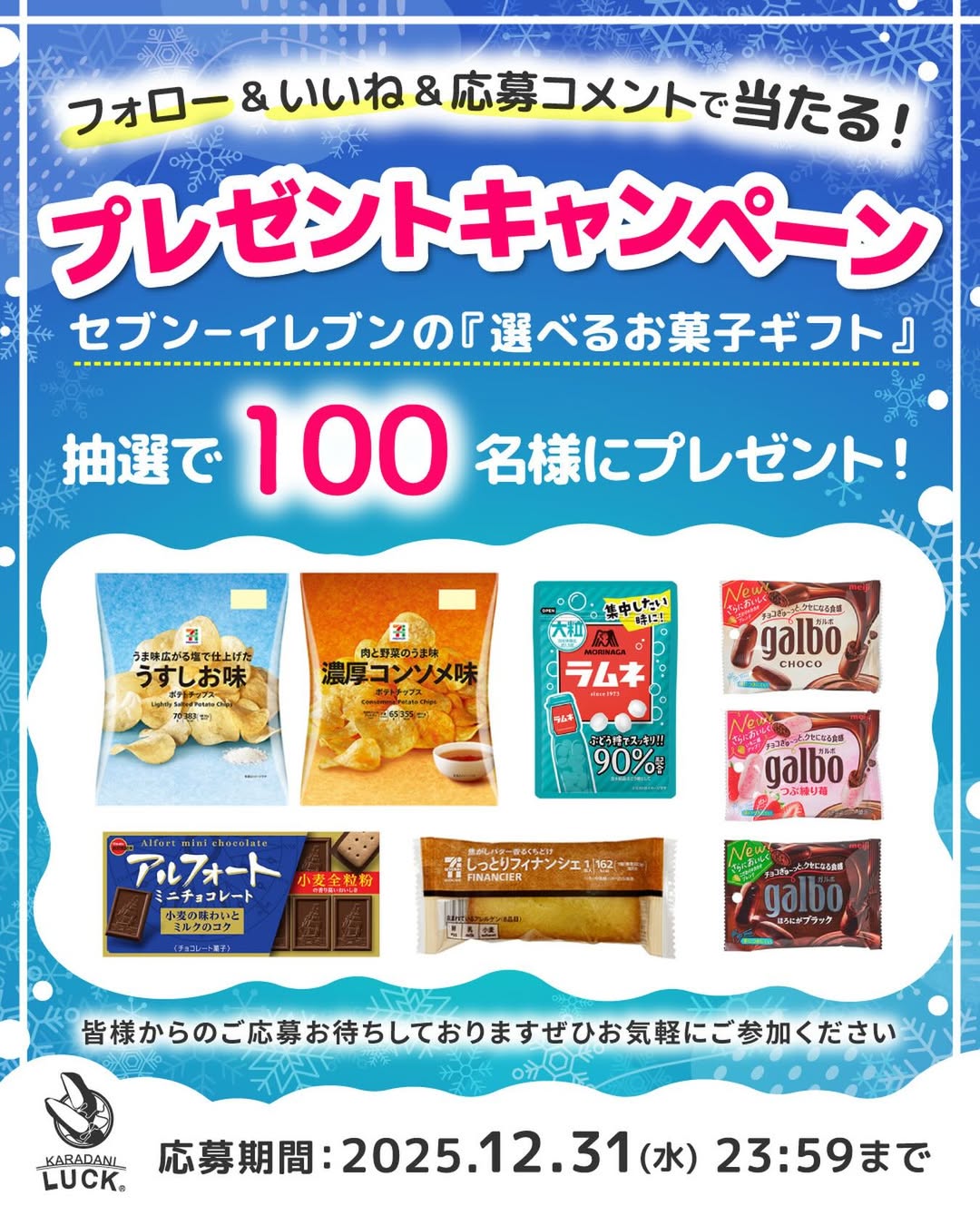 フォロー&いいね&応募コメントで、抽選で100名様にセブン-イレブンの『選べるお菓子ギフト』プレゼント