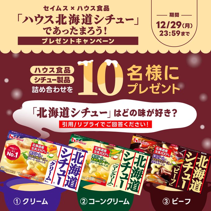 @seims_officialをフォロー&リポストし、回答を数字でリプライいただいた方の中から10名様に、ハウス食品 シチュー製品詰め合わせをプレゼント(引用もOKです)🎁
