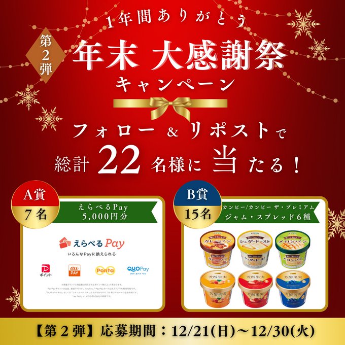 賞品:カンピー商品詰め合わせ、えらべるPay5,000円分(合計22名様)