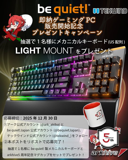 賞品:be quiet!最新静音メカニカルキーボード& arkhive5周年記念デザインマグカップ(1名様)