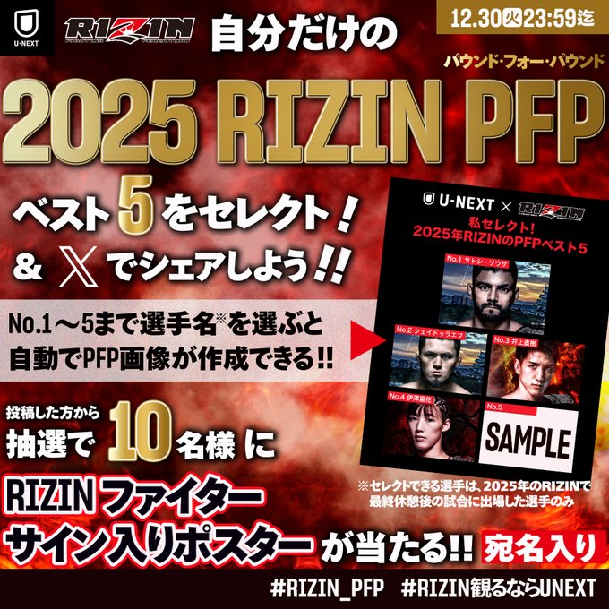2️⃣ で、ハッシュタグ #RIZIN_PFP #RIZIN観るならUNEXT を添えて、1️⃣で作成したPFP画像をポスト!