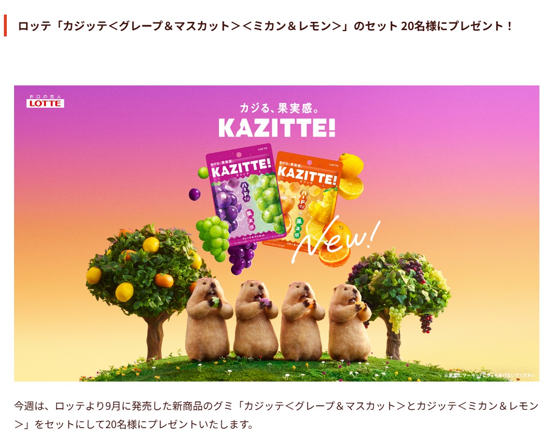 ロッテ「カジッテ<グレープ&マスカット><ミカン&レモン>」のセットを20名様にプレゼント 2025.12.28 2025.12.27王様のブランチ‐プレゼントキャンペーン 賞品:ロッテ「カジッテ<グレープ&マスカット><ミカン&レモン>」のセット(20名様) 締切:2025年12月28日(日)応募フォームより必要事項を入力してご応募ください。※詳細はキャンペーンページにてご確認ください。応募はこちらから