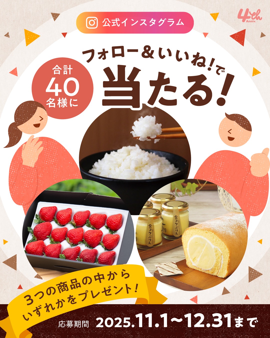 賞品:武下さんちのあまおう、有機特別栽培コシヒカリ、金のオススメセット(40名様)
