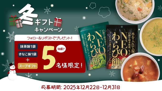 賞品:抹茶味1袋ときなこ味1袋+スープギフト(5名様)