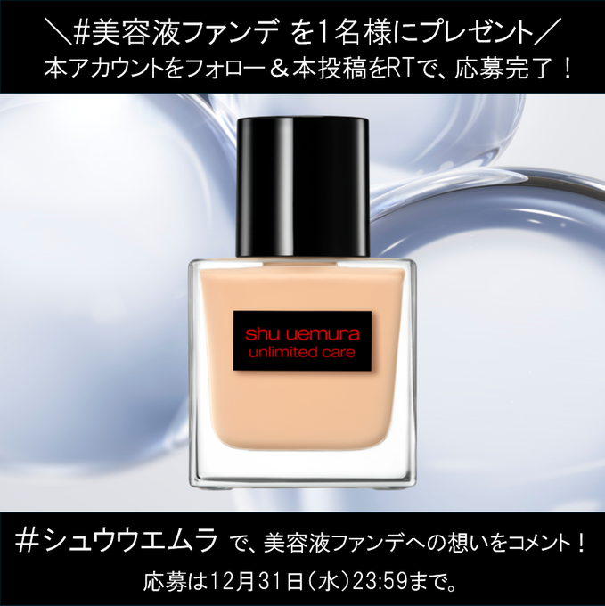 【X懸賞】シュウ ウエムラ 美容液ファンデを1名様にプレゼント 2025.12.28シュウ ウエムラ‐フォロー&リポストキャンペーン 賞品:美容液ファンデ(1名様) 締切:2025年12月31日(水)公式X(Twitter)アカウントをフォロー&キャンペーン対象ポストをリポストしてご応募ください。※詳細はキャンペーンページにてご確認ください。応募はこちらから