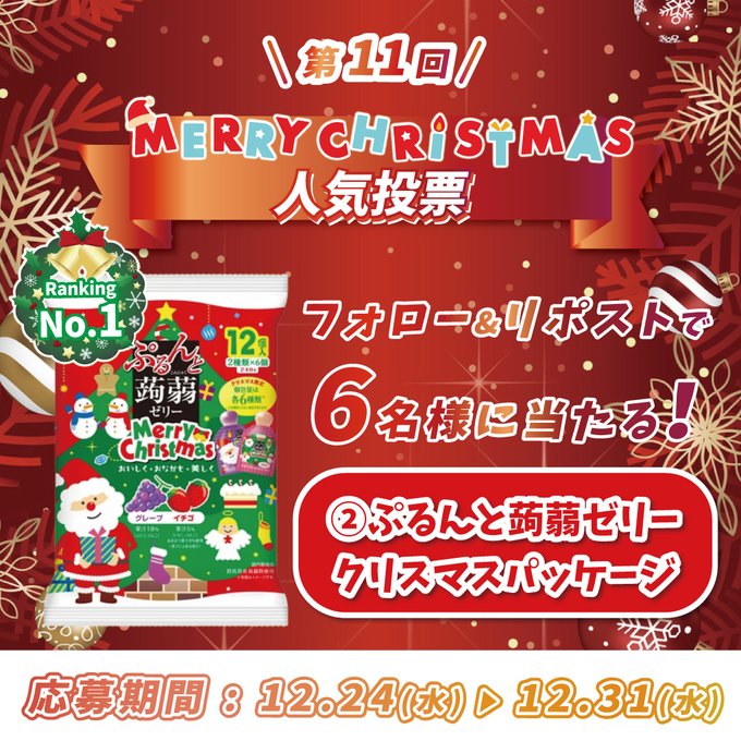 【X懸賞】ぷるんと蒟蒻ゼリー クリスマスパッケージを6名様にプレゼント 2025.12.28ぷるんと蒟蒻ゼリー‐フォロー&リポストキャンペーン 賞品:ぷるんと蒟蒻ゼリー(6名様) 締切:2025年12月31日(水)公式X(Twitter)アカウントをフォロー&キャンペーン対象ポストをリポストしてご応募ください。※詳細はキャンペーンページにてご確認ください。応募はこちらから