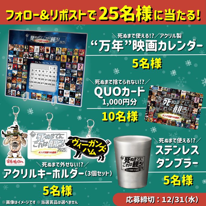 賞品:死ぬまでにこれは観ろ グッズ、オリジナルQUOカード1,000円分(25名様)
