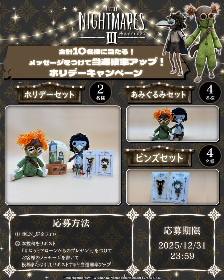 【X懸賞】オリジナルグッズを10名様にプレゼント 2025.12.30 2025.12.29リトルナイトメア‐ホリデーキャンペーン 賞品:オリジナルグッズ(10名様) 締切:2025年12月31日(水)公式X(Twitter)アカウントをフォロー&キャンペーン対象ポストをリポストしてご応募ください。※詳細はキャンペーンページにてご確認ください。応募はこちらから